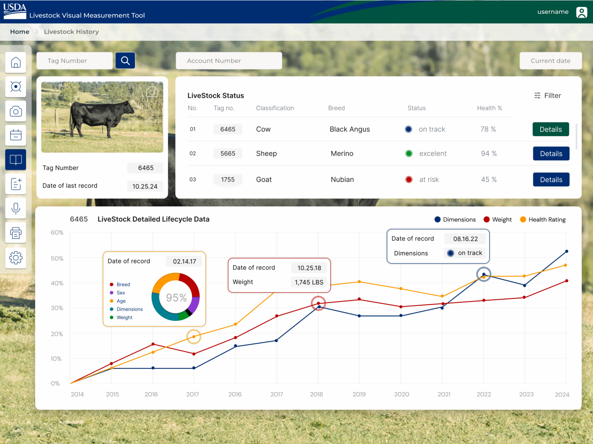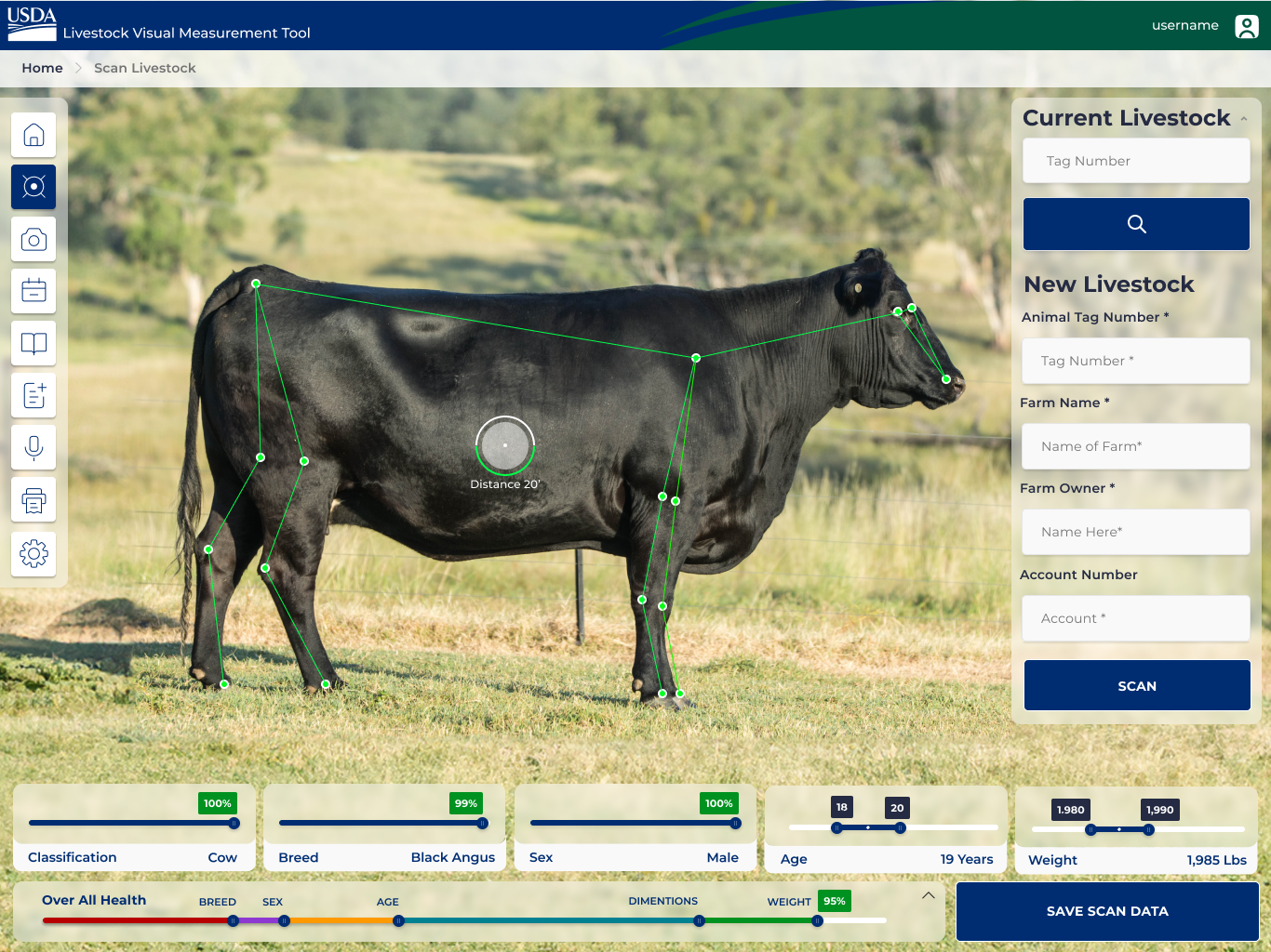 Moo! As the UI/UX designer for this USDA project, I designed an iPad-based interface to assist inspectors in evaluating the health and market value of cattle using spatial mapping technology. The tool was built to scan and analyze livestock in real time, providing visual overlays and measurements to help inspectors make informed assessments quickly and consistently. My focus was on creating a straightforward, field-ready interface optimized for outdoor use—featuring high-contrast visuals, large touch targets, and intuitive controls that function well in fast-paced, unpredictable environments. The design supported USDA’s goals of standardizing evaluations and improving the efficiency of the cattle pricing process at point of sale.