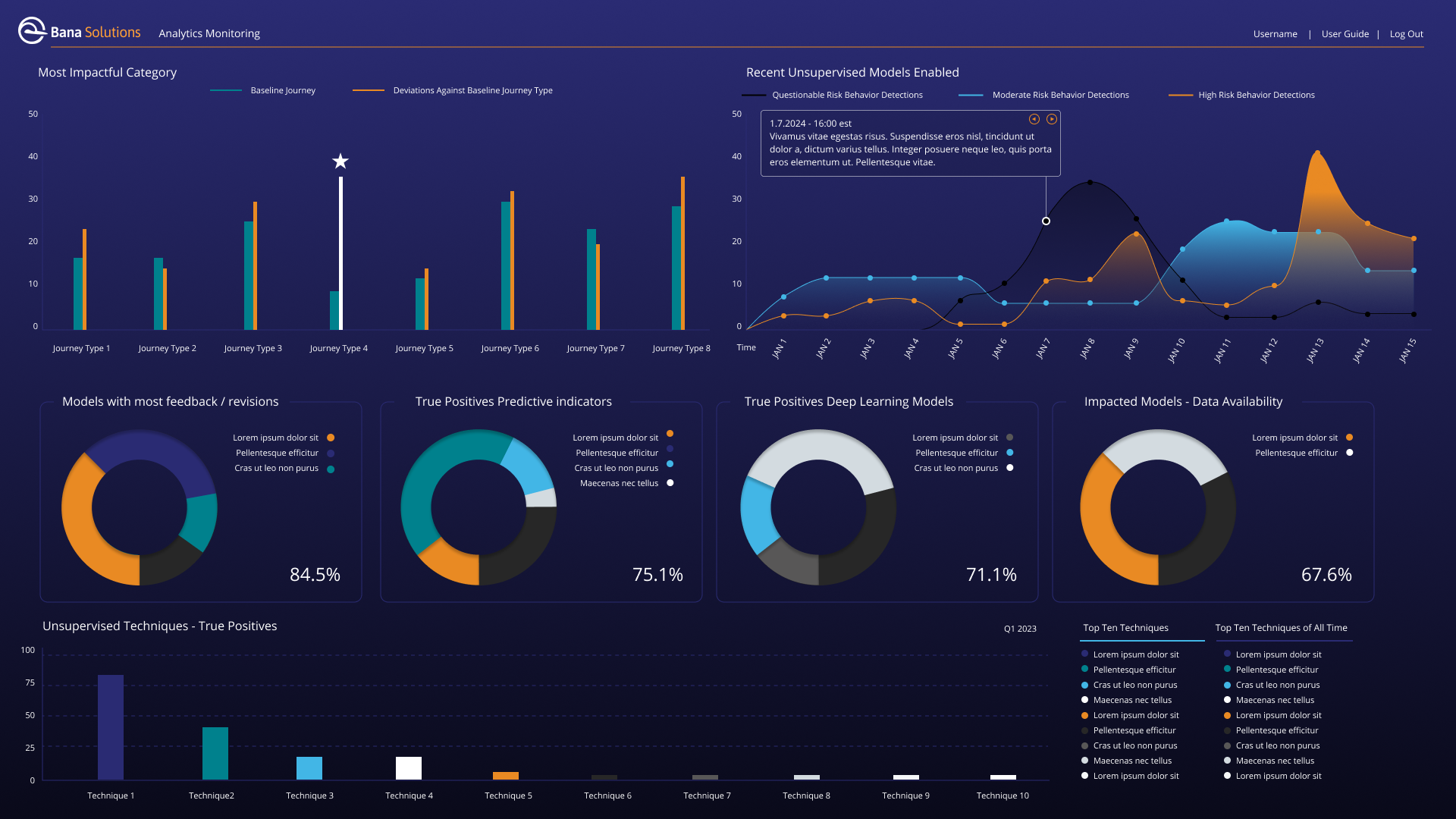 As the UI/UX designer for this advanced analytics dashboard created for Bana Solutions, my goal was to translate complex data models into an intuitive and visually engaging experience. I designed the interface to balance dense information with visual clarity—leveraging data visualization best practices, strong typographic hierarchy, and a consistent, high-contrast color palette to guide the user through layered insights. Key features include interactive journey analysis, risk behavior tracking over time, and true positive indicators broken down by model type and technique. The use of dark mode enhances legibility for extended screen time, while subtle gradients and minimalistic chart styles reduce cognitive load. Every design decision was driven by the need to support rapid pattern recognition and informed decision-making, particularly for users in high-stakes data environments. This dashboard embodies the principles of user empowerment, allowing analysts to detect trends and anomalies with confidence and efficiency.