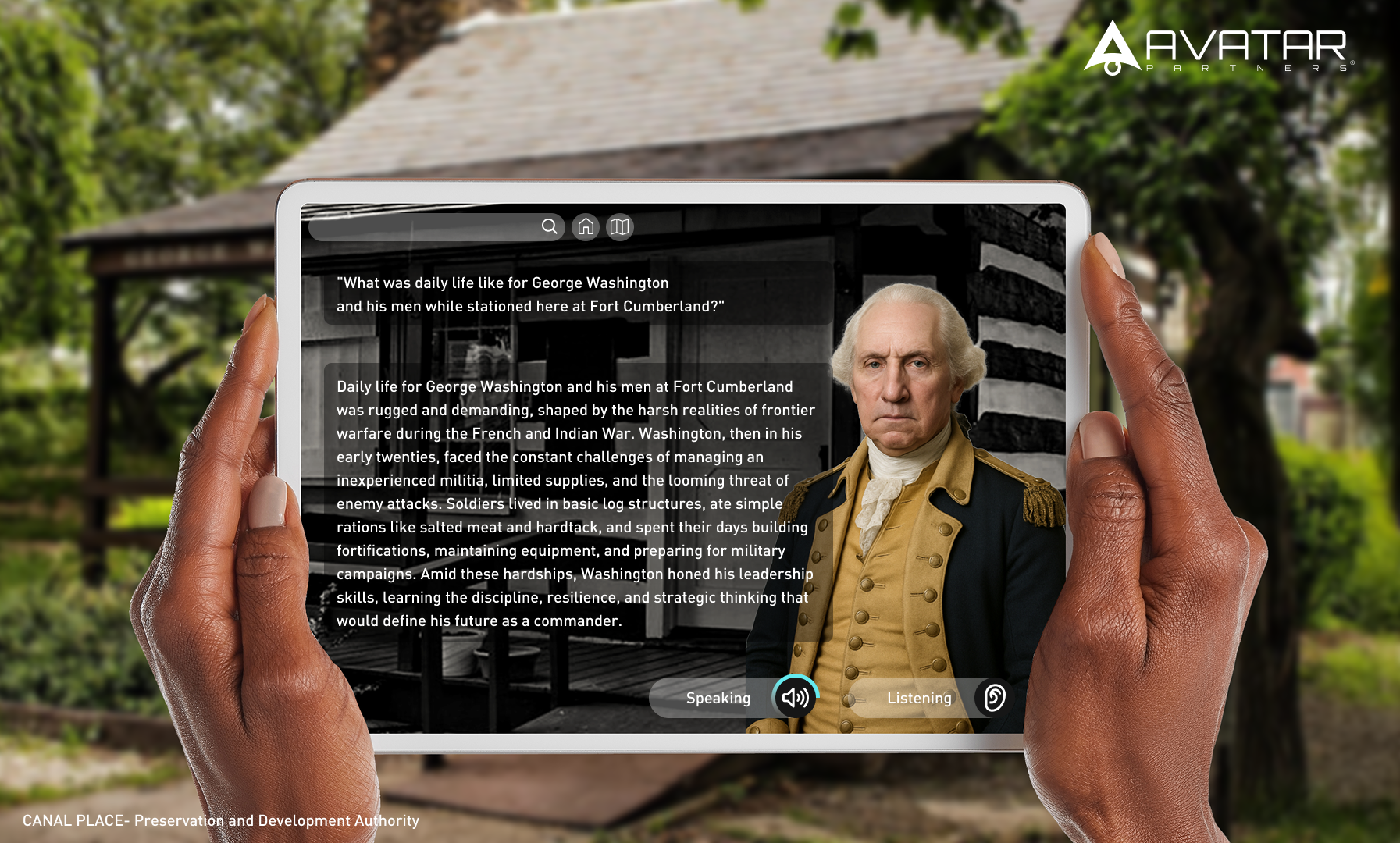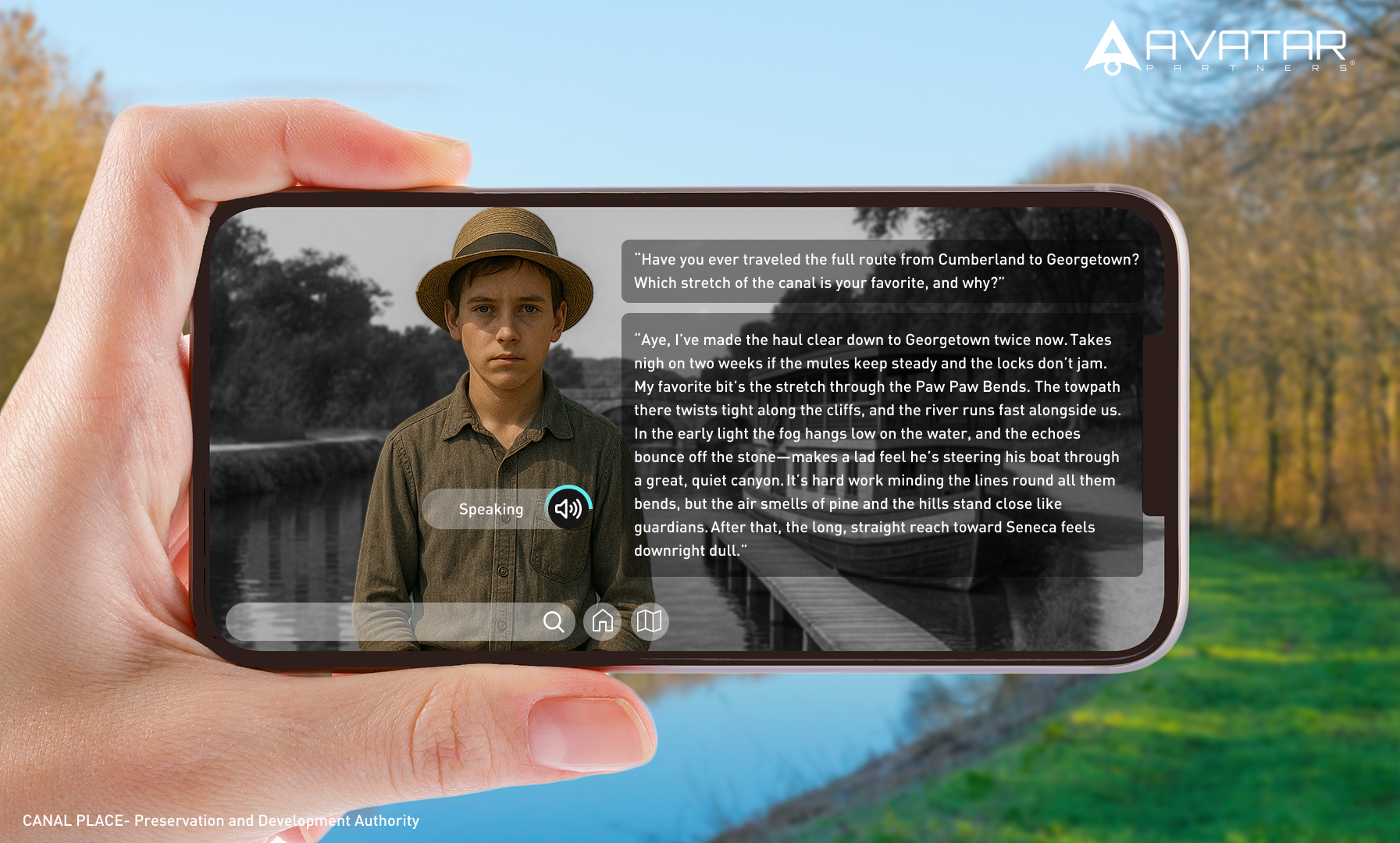 As the UI/UX designer for this Canal Place project, I developed a prototype interface for an XR-enabled, AI-powered tour guide application designed for use in historical locations. The experience allowed users to geo-locate points of interest, then engage in real-time conversations with AI agents who could recall and narrate stories tied to the site’s history. My design focused on creating a clean, approachable interface that made complex technology feel seamless and intuitive—blending voice interaction, spatial awareness, and contextual storytelling. The layout emphasized clarity, with simple navigation, voice cue indicators, and iconography that guided users through both AR and dialogue-based interactions. This prototype helped bring the past to life by combining spatial computing with natural conversation, transforming the way people explore and connect with history.