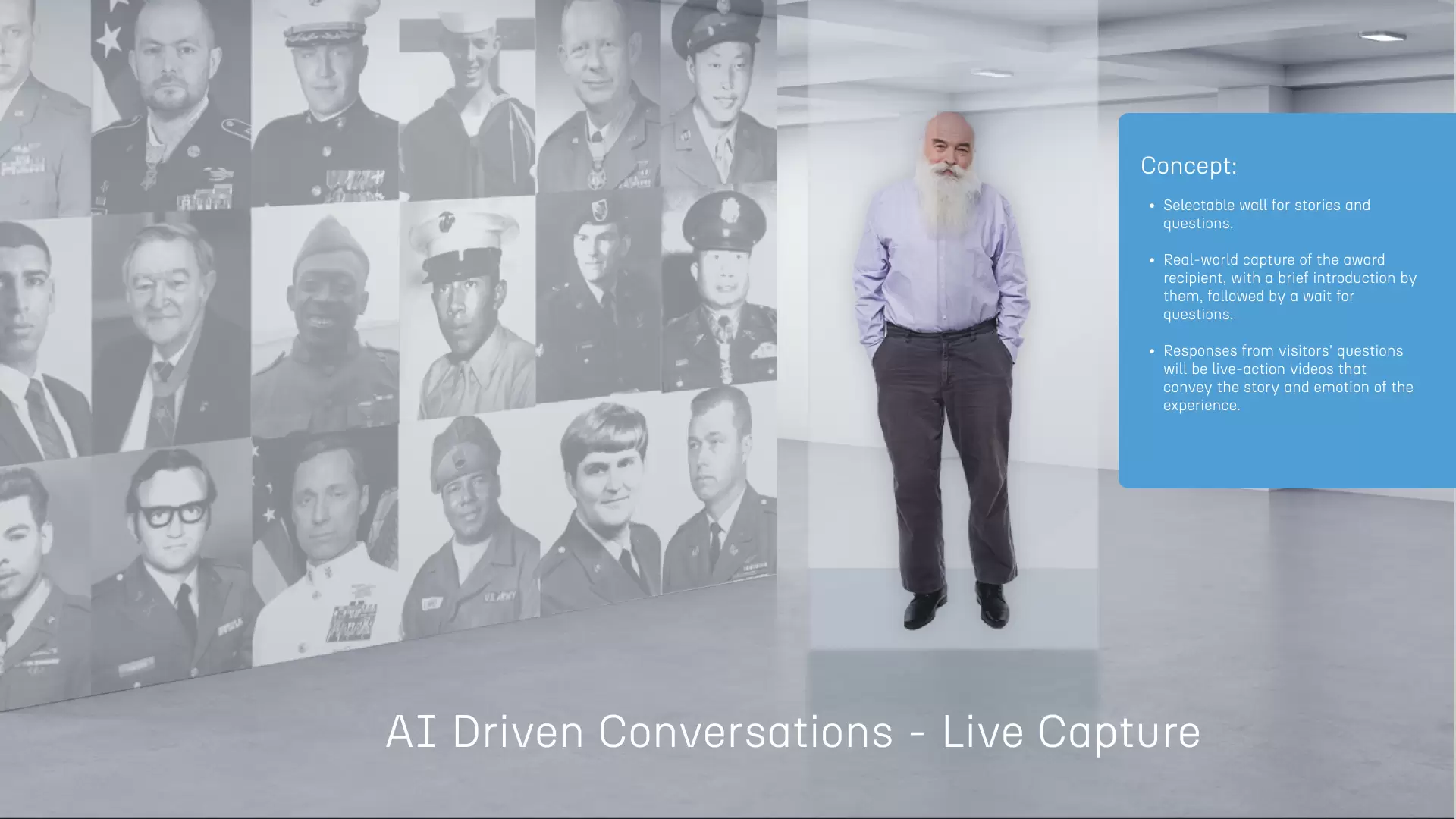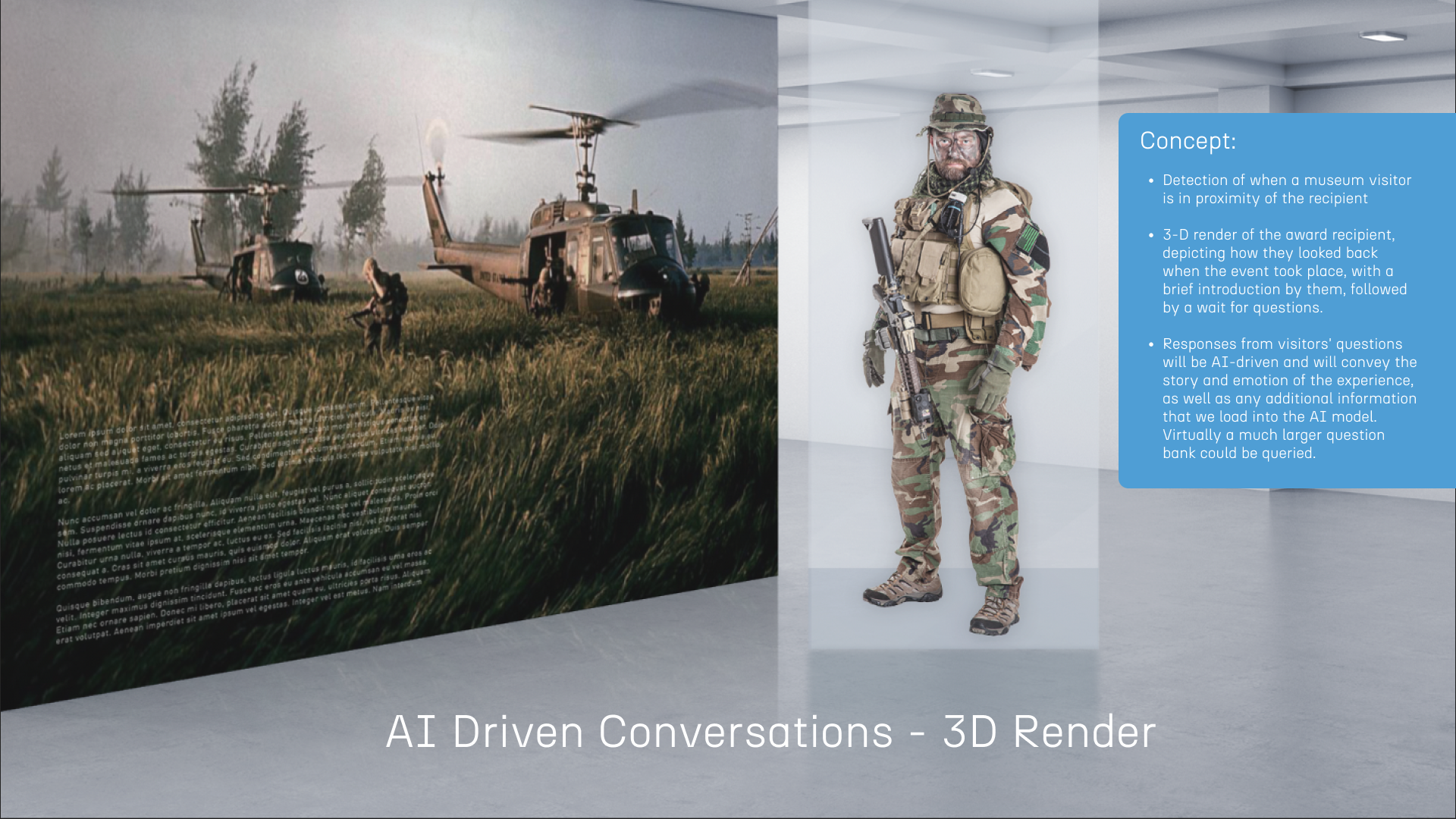 As the UI/UX designer for the Medal of Honor Museum’s interactive display area, I crafted an immersive experience that allows visitors to engage in meaningful conversations with photorealistic 3D representations of veterans. Leveraging cutting-edge AI agent technology, these virtual veterans respond authentically, creating an emotional and educational connection between museum-goers and the personal stories of service members. My role focused on designing intuitive user interfaces and seamless interactions that blend advanced AI-driven dialogue with visually compelling digital avatars, ensuring accessibility and immersion for a diverse audience.