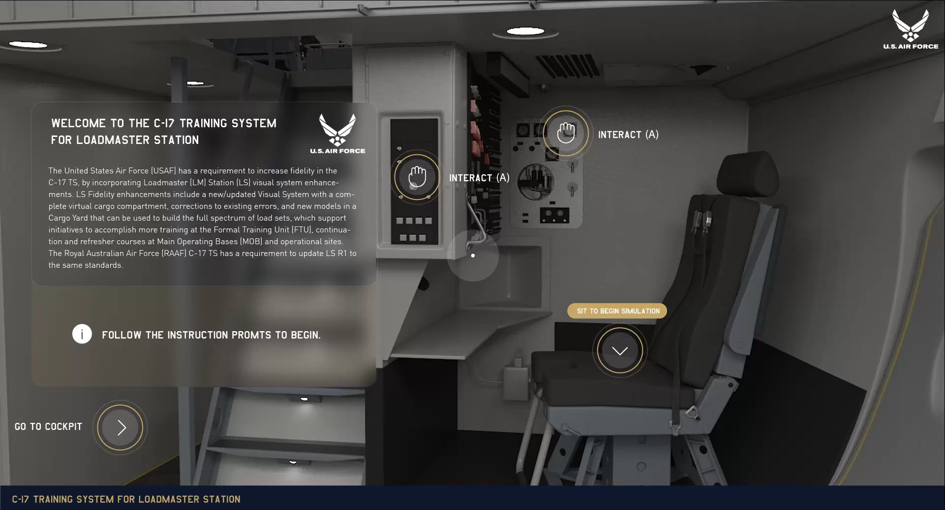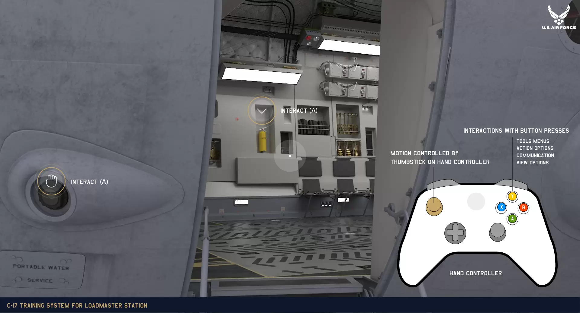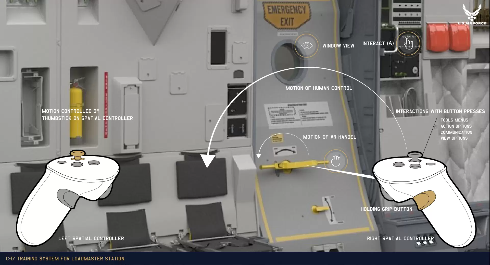 As the UI/UX designer for the C-17 Loadmaster Training System, my goal was to create a flexible and intuitive experience that could be deployed across multiple platforms. The system’s design accommodates both traditional screen-based interactions and a fully immersive VR environment. For classroom settings, the interface was optimized for multi-touch gestures on a monitor, allowing users to interact with the virtual station through simple taps and swipes, making the system accessible and familiar. For the immersive experience, we utilized a dual spatial controller setup. The right spatial controller manages core interactions like selecting menus and pressing buttons, while the left spatial controller provides precise control for manipulating levers and dials. This multi-platform approach ensures that regardless of the learning environment—be it a classroom or a dedicated VR training bay—the user experience remains consistent and effective. It allows loadmasters to build critical muscle memory and procedural knowledge in a realistic, consequence-free environment, preparing them for their real-world duties with confidence.